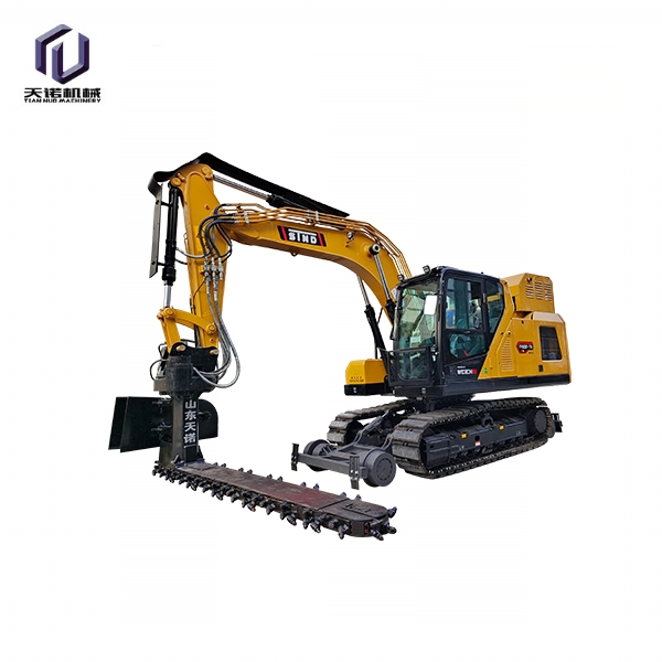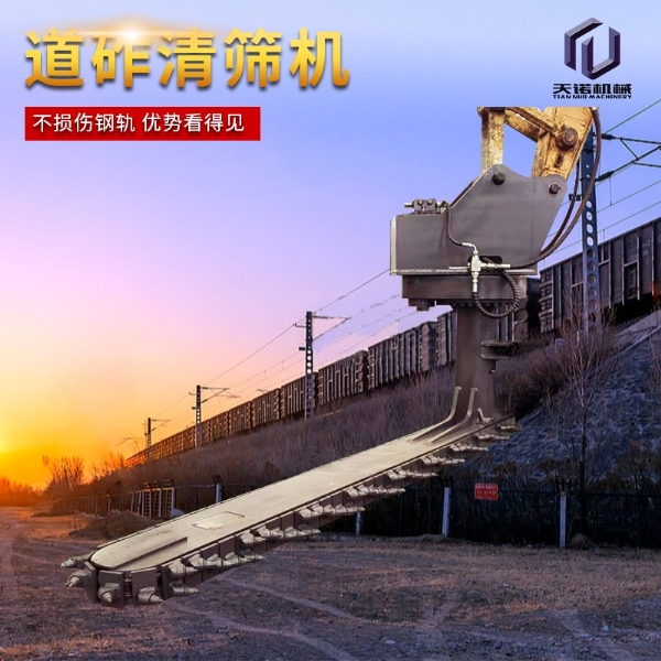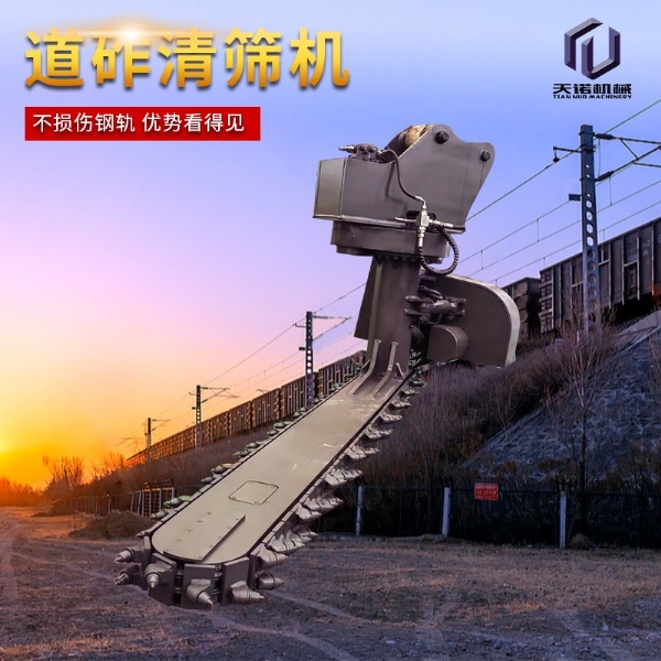 目前,鐵路交通發(fā)展迅速,對(duì)于年久的鐵路路基下面的石子需要定期更換,對(duì)于鐵路上的清渣機(jī)需要大型設(shè)備操作十分的不方面,采用人工又十分耗時(shí),工作效率比較低下;為解決上述問題,克服現(xiàn)有技術(shù)的不足,天諾工程機(jī)械研發(fā)了一種能夠在狹小空間內(nèi)作業(yè)、操作簡單、效果高的鐵路清渣機(jī);鐵路清渣機(jī)包含扒渣鏈部、清渣板部、安裝部和連接部,安裝部設(shè)置在扒渣鏈部的上部,其用于與挖掘機(jī)連接;清渣板部設(shè)置在扒渣鏈部的尾端,清渣板部和扒渣鏈部通過連接部相連;扒渣鏈部包括鏈條,鏈條由若干首尾相連的鏈節(jié)組成,鏈節(jié)包括支座和設(shè)置在支座上的截齒;若干截齒呈波浪式陣列布置;安裝部包括上座板和下座板,上座板和下座板之間設(shè)置有回轉(zhuǎn)支承,上座板上部設(shè)置有兩個(gè)相互平行的大耳板。鐵路清渣機(jī)是為鐵路道咋清理而設(shè)計(jì)的一款鐵路專用屬具,鏈條式道咋清理機(jī)需安裝在150挖掘機(jī)前端,并從軌道外側(cè)位置清理,通過大扭矩馬達(dá)帶動(dòng)免維護(hù)鏈條上作業(yè)鏈條上裝置超耐磨的合金屬具對(duì)道床道砟進(jìn)行連續(xù)清理的技術(shù),排列使得道砟的清理及更換更加簡單高 效,提高了施工速度同時(shí)節(jié)省了勞動(dòng)力。